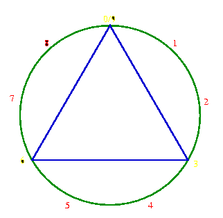It may seem strange here and throughout this essay to see these apparently unequal divisions called equivalent stages, but I take my cue from Rodney Collin, who pointed out the vast difference in time perception that occurs as we grow older. (Collin used a different scale, a logarithmic scale based on 10 lunations, to plot human development around the enneagram circle.) Everyone knows that common adult expression "time flies", but it doesn't fly for the child. The stages, as we move along the circle, enclose progressively more years yet contain an equivalency in experience and change.
